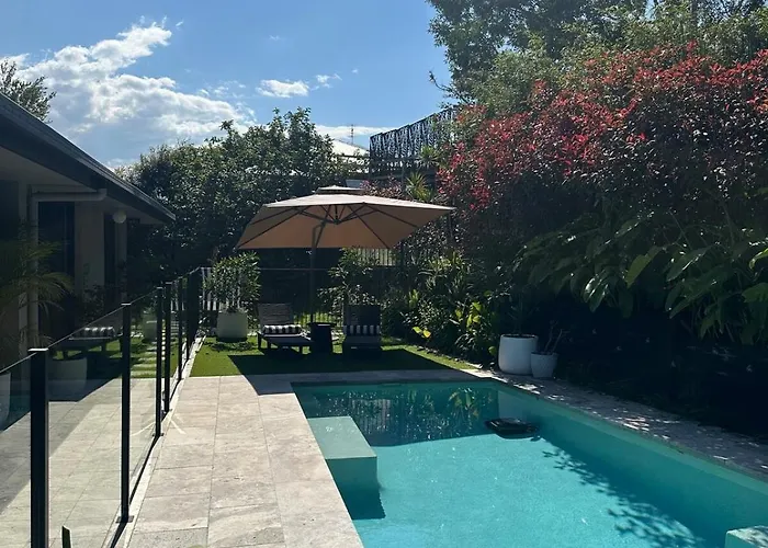 Peaceful Tropical Oasis Central Coolum Beach Dog Friendly クーラムビーチ 別荘はポイント・ペリーから徒歩で25分以内の場所に位置し、プライベートなプールを提供しており、リラックスした滞在を楽しむことができます。